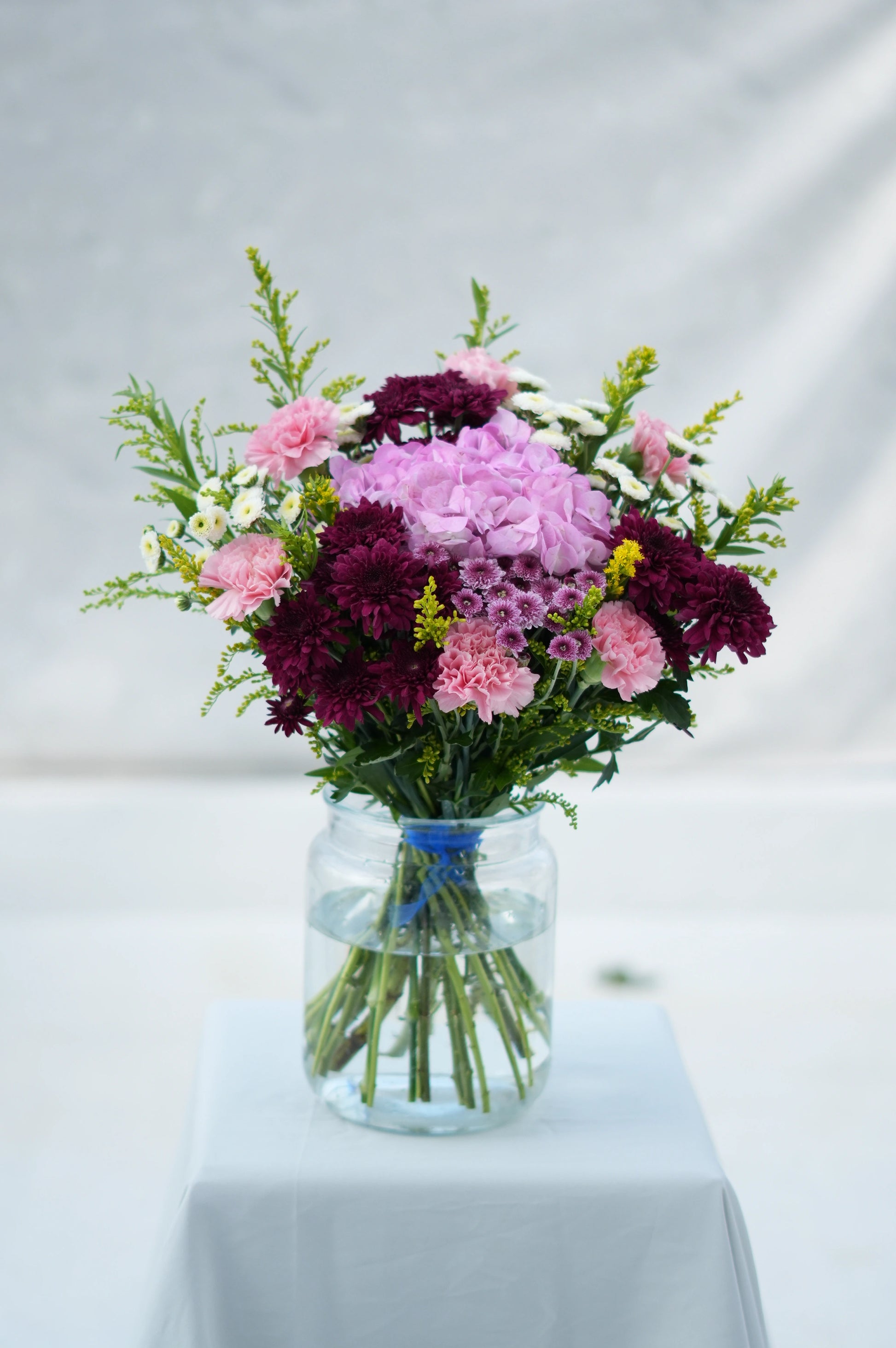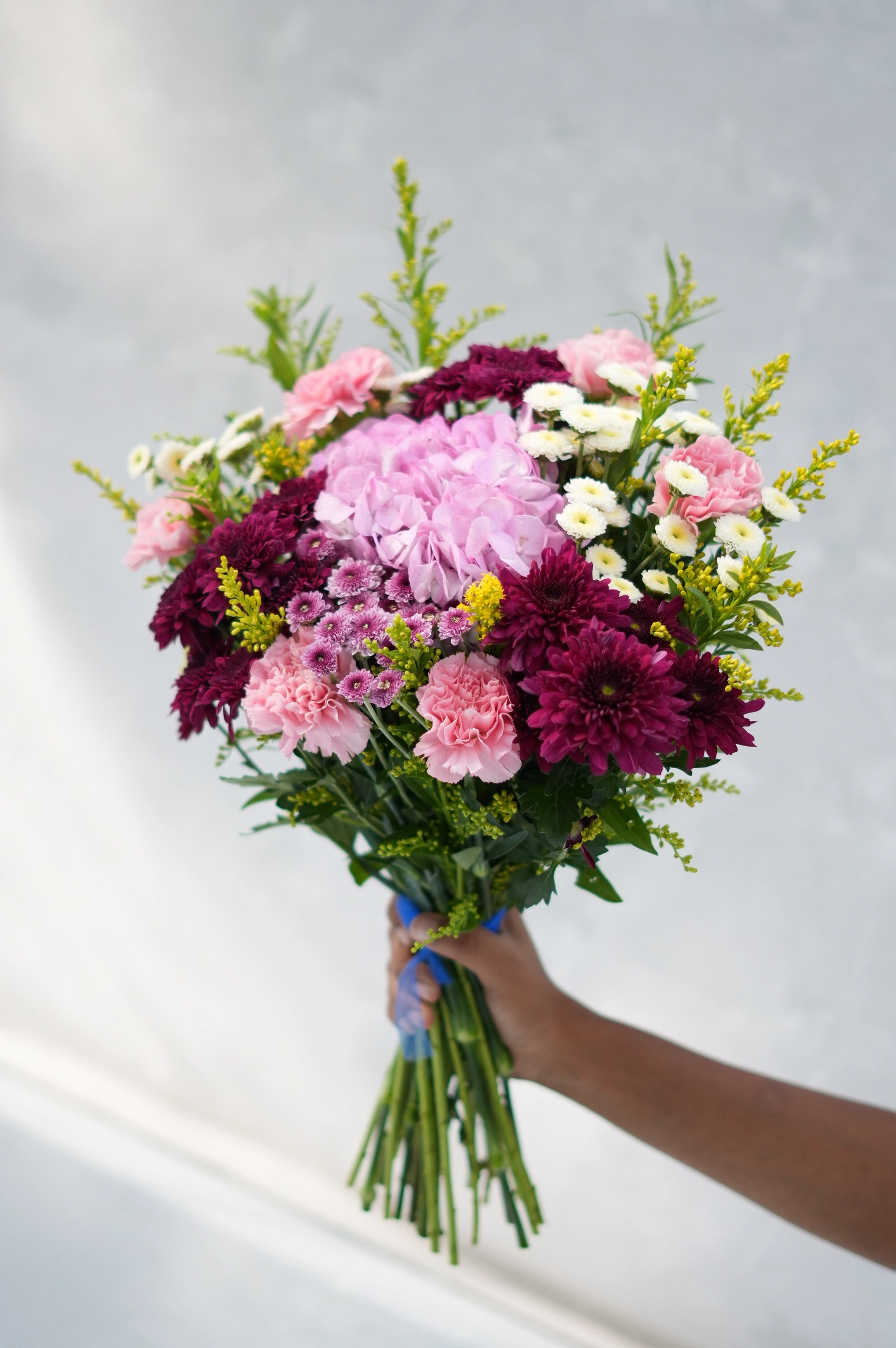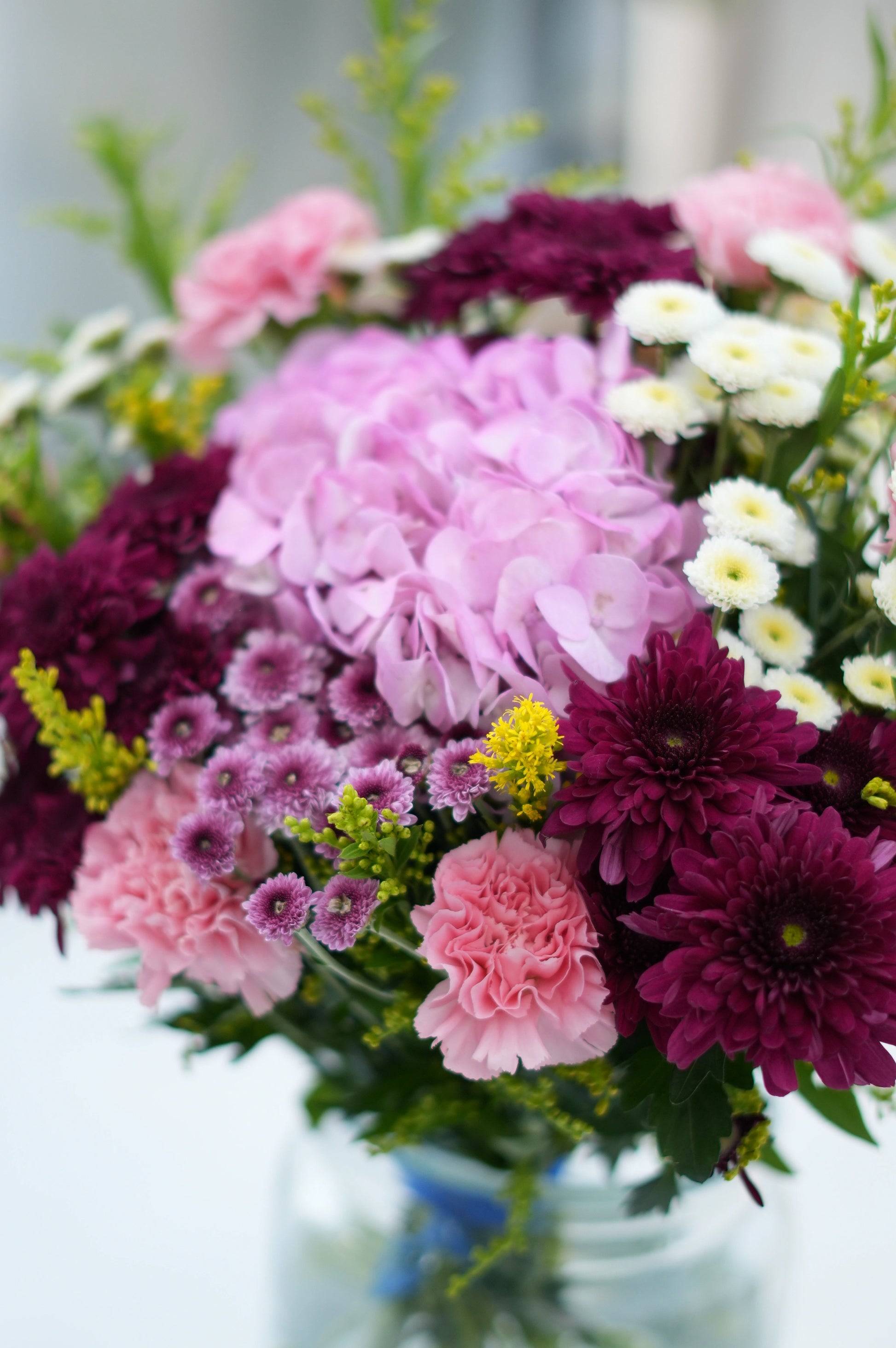 What's in your bouquet - Hydreangea, Chrysanthemum, Calimero, Carnation, and Golden Rod