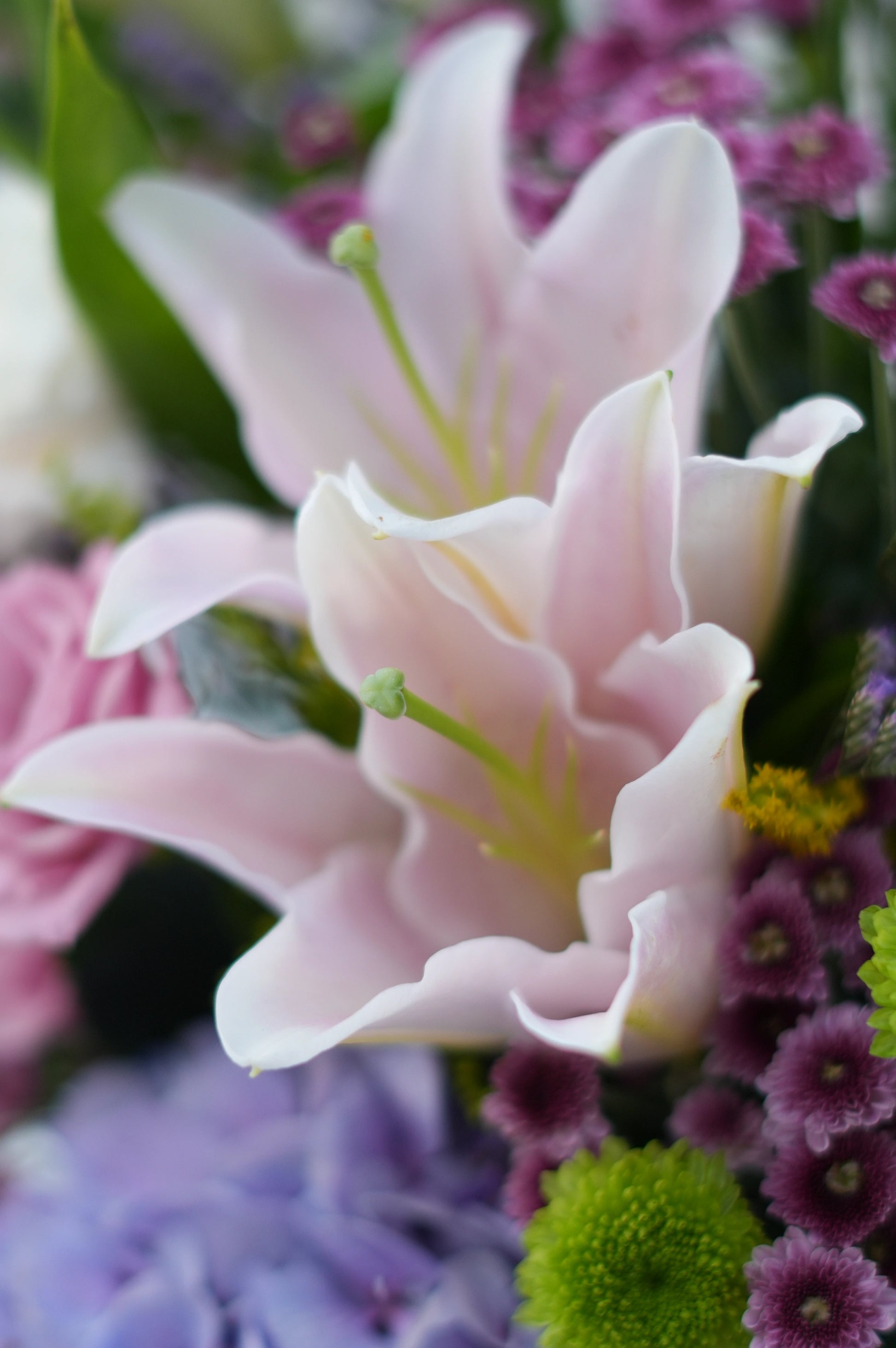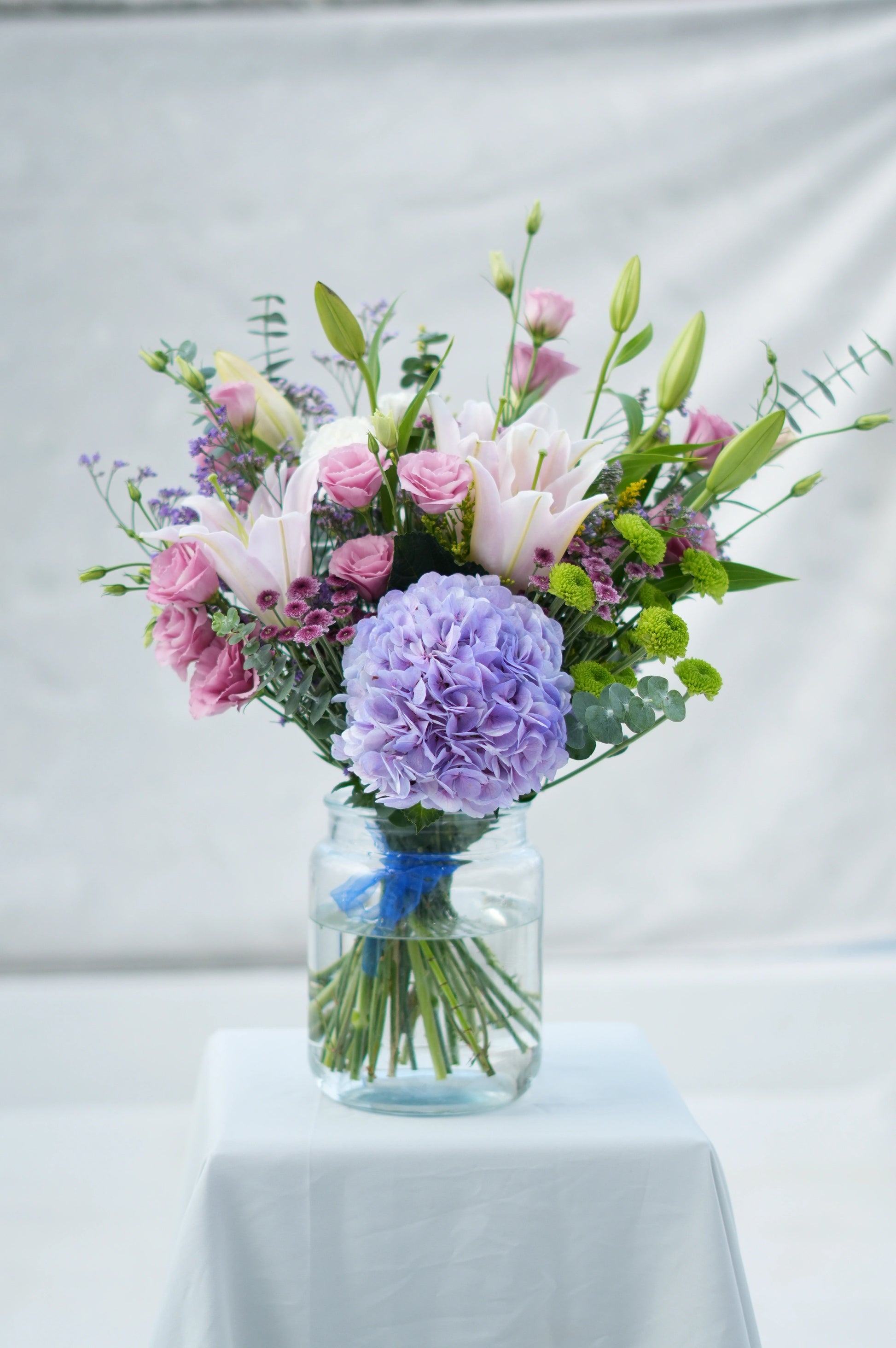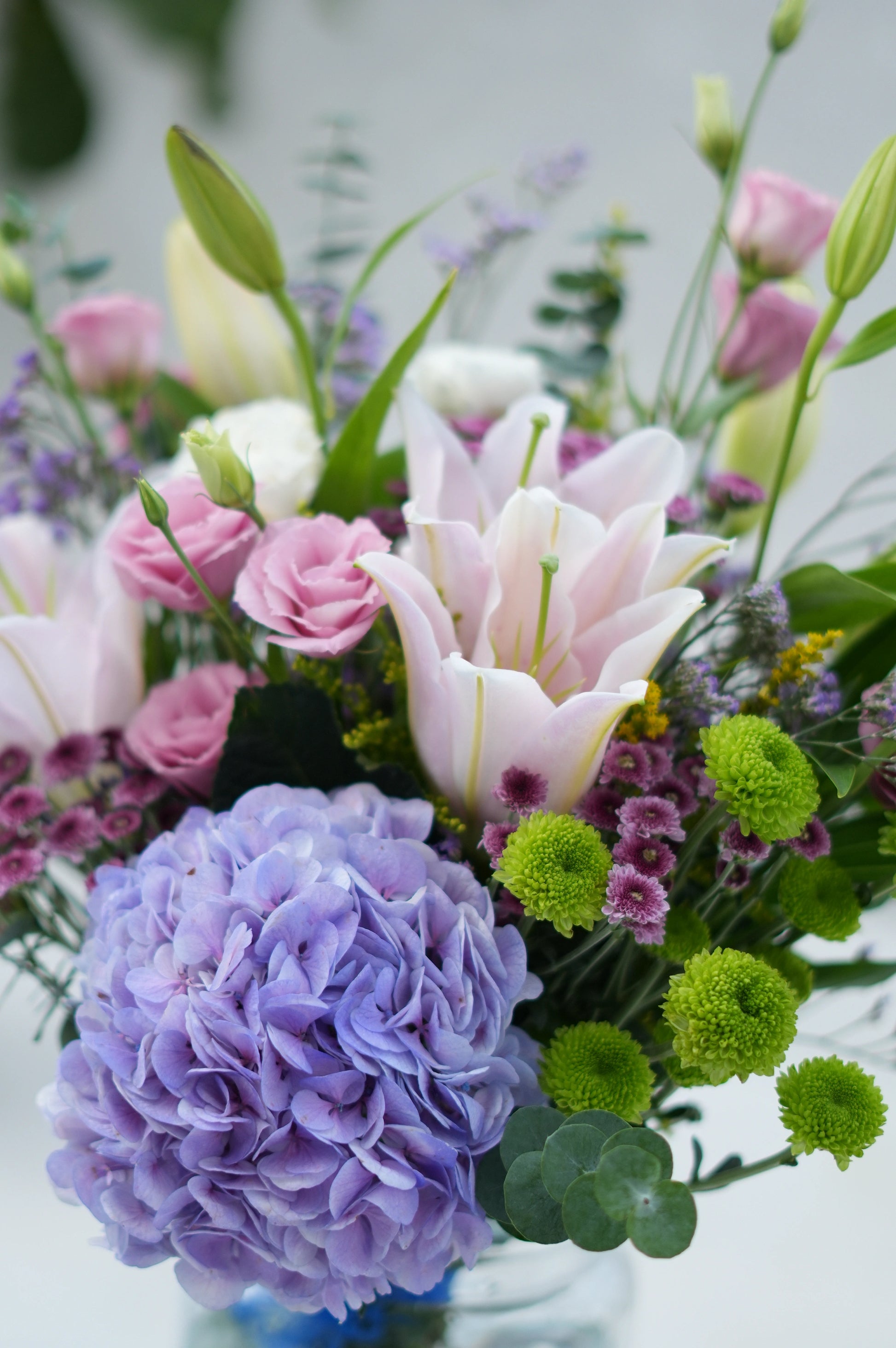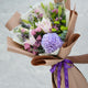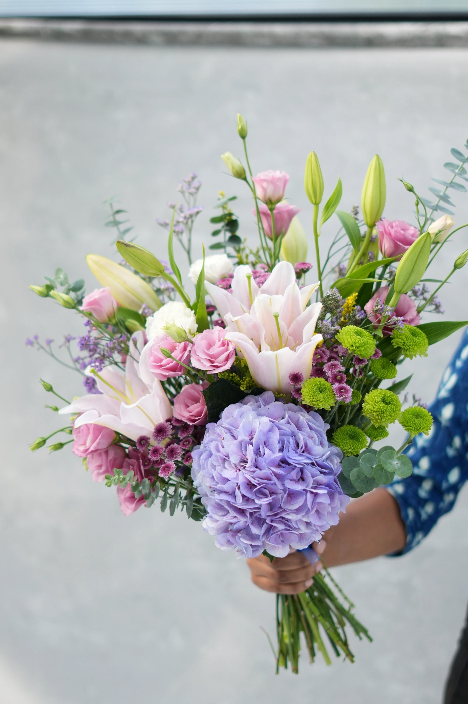 What's in your bouquet - Blue Hydrengea, Eustoma, Lilies,Green Button, Calimero, Purple Limonium , and Baby Dollar