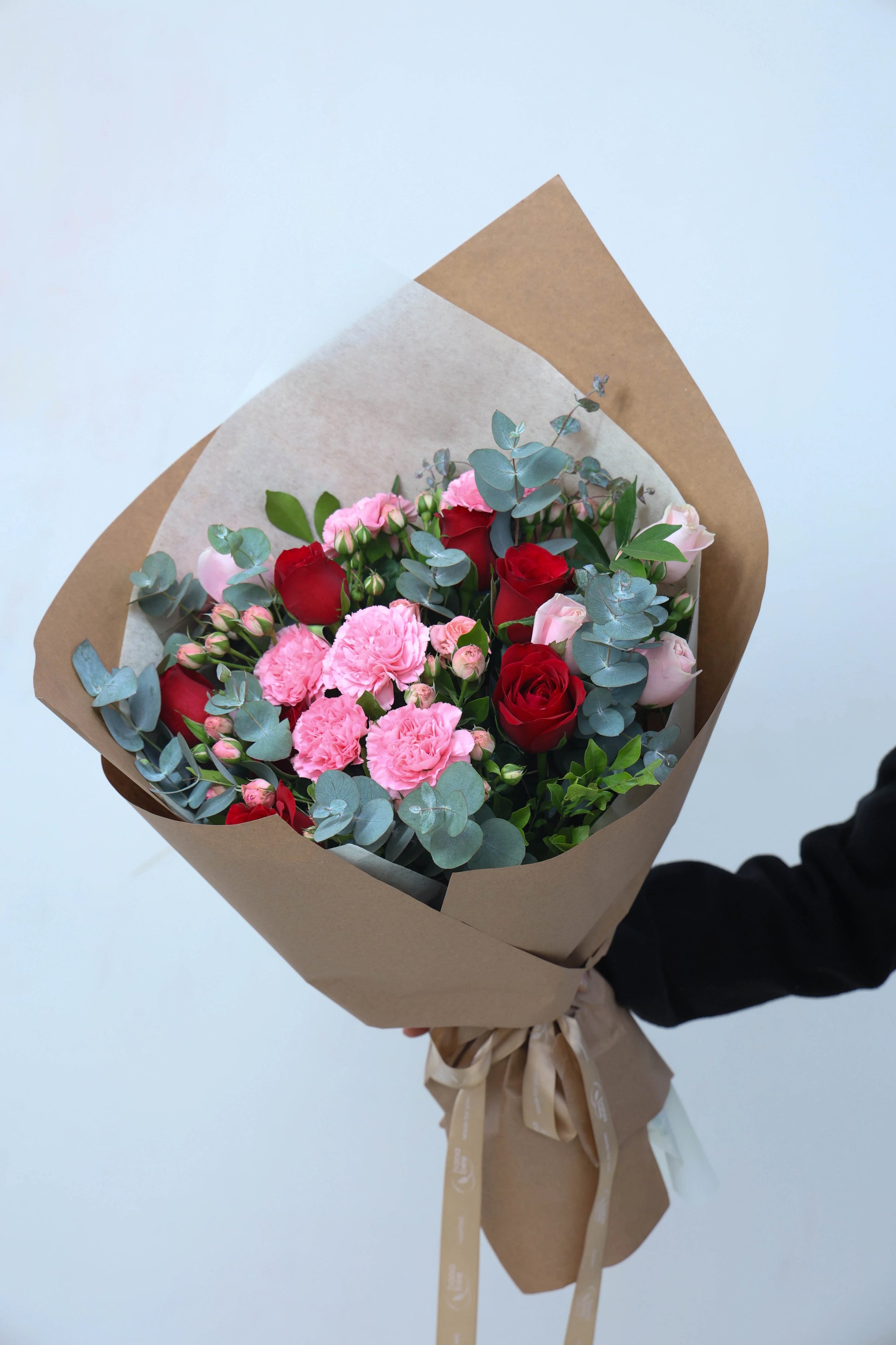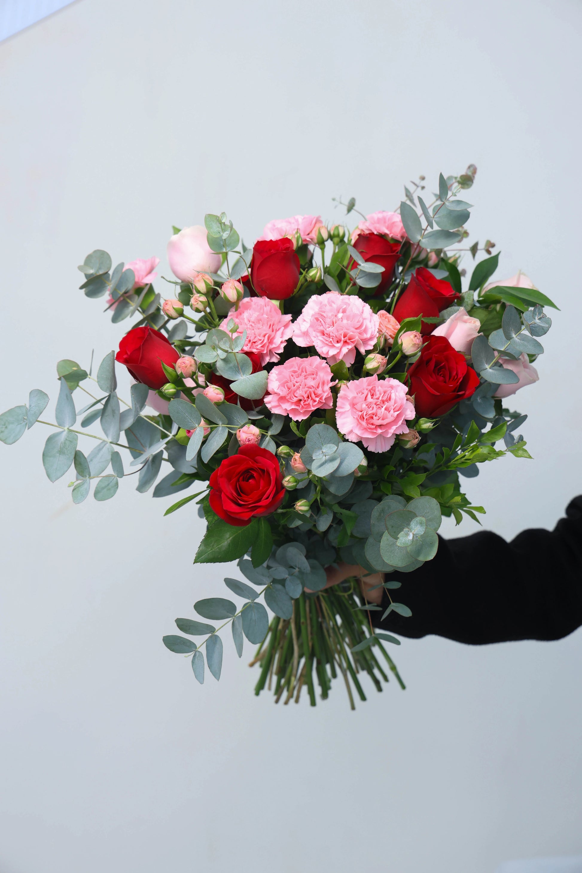 What's in your bouquet - Carnations, Spary Carnations, Roses, Eucalyptus.