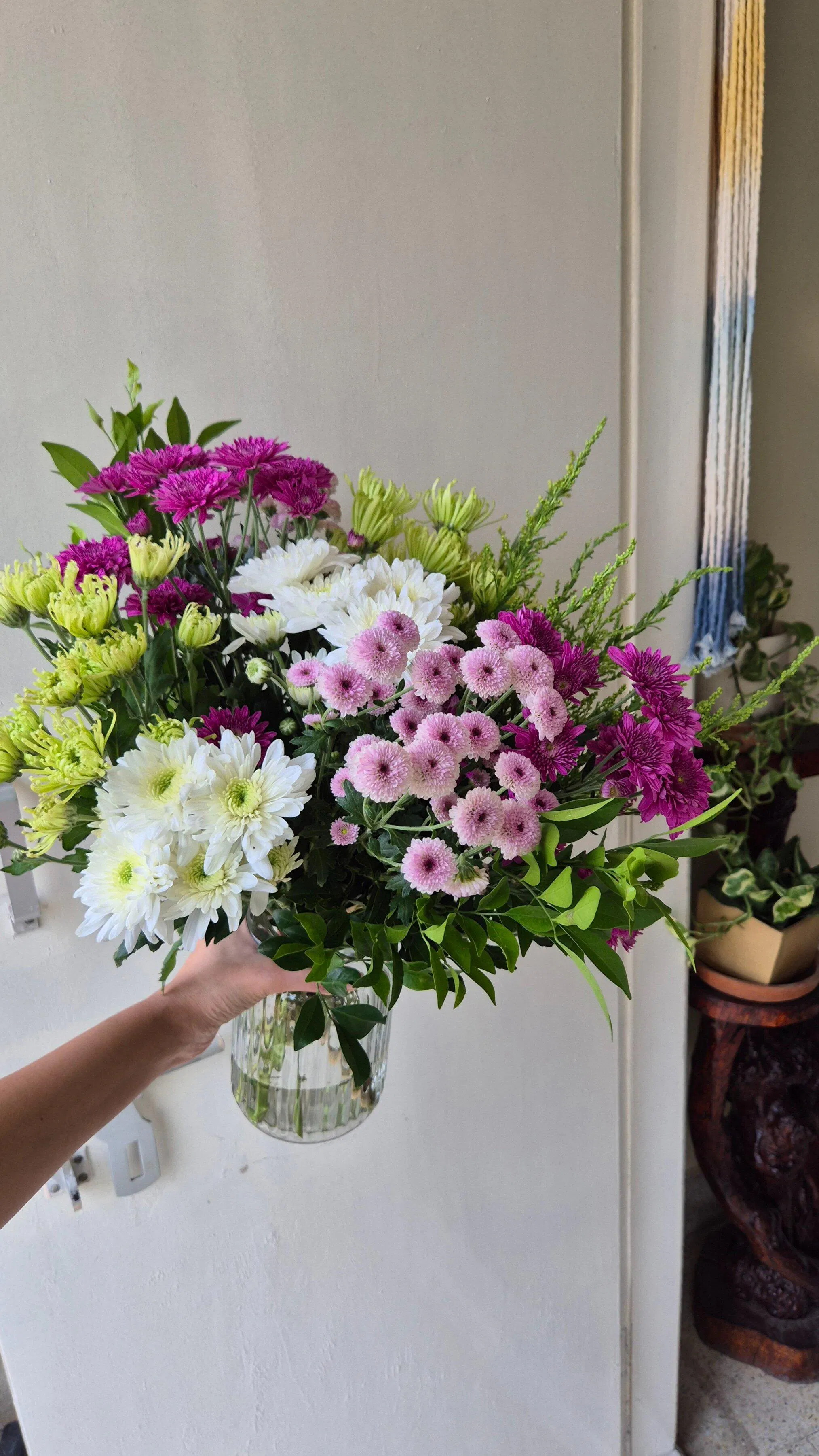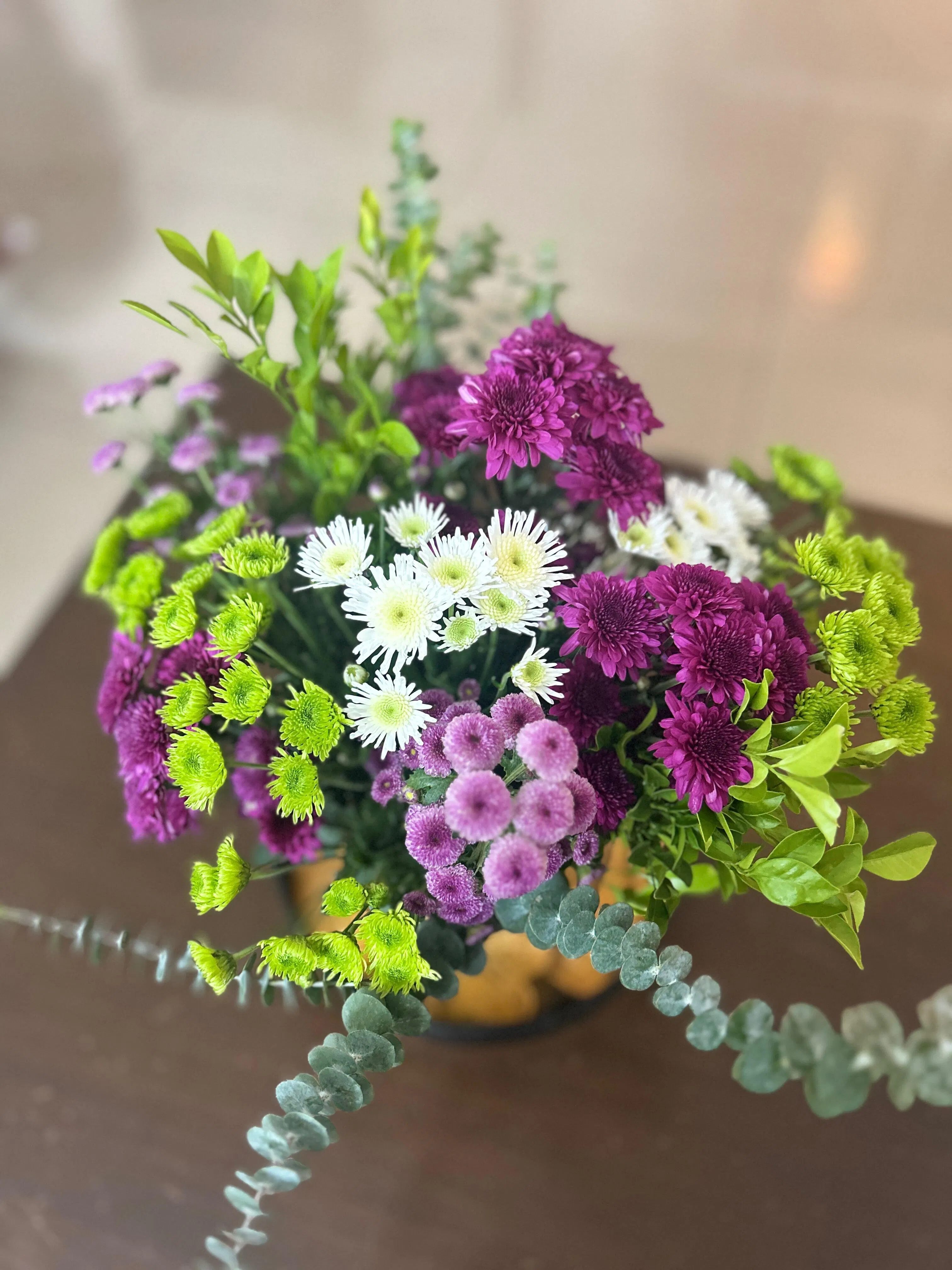 Strong, but never loud. Gentle, yet grounding. This mix of purple and white chrysanthemums with hints of green and pink reflects the kind of strength moms carry every day—the kind that quietly holds it all together.